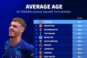 本賽季英超球隊(duì)陣容平均年齡排名(年輕到年長(zhǎng)):