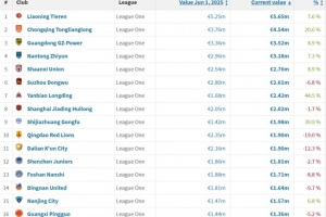 體育資訊6月25日訊 日前,德國(guó)轉(zhuǎn)會(huì)市場(chǎng)網(wǎng)站統(tǒng)計(jì)了更新后的中甲球隊(duì)身價(jià)排行。