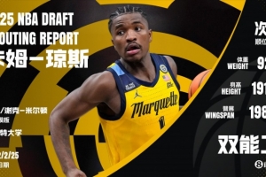 卡姆-瓊斯是來自馬奎特大學(xué)的大齡即戰(zhàn)力后衛(wèi),技術(shù)成熟度高,對擋拆的運用與終結(jié)的創(chuàng)造力能達到NBA層級,但運動能力是他的最大短板。進入NBA后,球隊可能需要在防守端把他“藏一藏”,避免其頻繁遭遇擋拆或換防的場景,會比較適配中鋒蹲坑的五外體系,可以充當(dāng)打10-15分鐘的替補持球手角色,但23歲的年紀(jì)基本上沒有太多的改造空間,手握次輪簽的球隊完全可以將其視作板凳奇兵押上一注。
