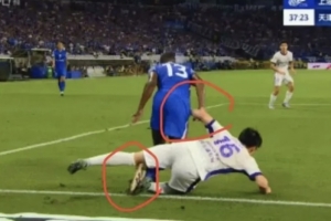 第17分鐘,特謝拉接隊(duì)友傳球,郭皓在特謝拉沒有任何防備的情況下,故意用肘部撞擊特謝拉的背部。郭皓的這一動(dòng)作夠得上黃牌的標(biāo)準(zhǔn),但國際級(jí)裁判金京元并沒有出牌。