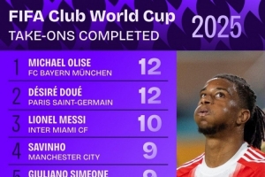 體育資訊6月28日訊 Squawka統(tǒng)計(jì)了球員在本屆世俱杯小組賽中的成功過(guò)人次數(shù),并列出榜單,奧利塞、杜埃12次并列居首,梅西10次第三。