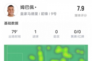 體育資訊1月17日訊 西班牙國王杯1/8決賽,皇馬對陣塞爾塔,姆巴佩首發(fā)出戰(zhàn),貢獻(xiàn)1粒進球,送出1次關(guān)鍵傳球,3次過人成功,但也錯失1次進球機會,評分7.9。