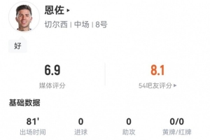 體育資訊6月29日訊 切爾西在本屆世俱杯1-0領(lǐng)先本菲卡,恩佐本場(chǎng)數(shù)據(jù)如下: