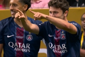 巴黎圣日耳曼出場陣容:1-多納魯馬、2-阿什拉夫、5-馬爾基尼奧斯、25-門德斯、51-帕喬、8-法比安、17-維蒂尼亞、87-若奧-內(nèi)維斯、7-克瓦拉茨赫利亞、14-杜埃、29-巴爾科拉