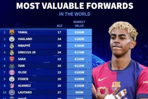 體育資訊6月30日訊 《轉(zhuǎn)會市場》統(tǒng)計了最新的鋒線球員身價情況,巴薩17歲小將亞馬爾以2億歐元獨自領(lǐng)跑。
