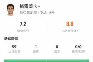 體育資訊6月30日訊 拜仁在世俱杯16強(qiáng)戰(zhàn)3-2領(lǐng)先弗拉門戈,格雷茨卡本場(chǎng)數(shù)據(jù)如下:
