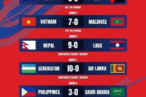 此外,還出現(xiàn)了多場比分差距較大的比賽,具體為:泰國女足7-0擊敗伊拉克女足,緬甸女足8-0擊敗土庫曼斯坦女足,中國臺北女足8-0擊敗巴基斯坦女足,孟加拉國女足7-0巴林女足,越南女足7-0馬爾代夫女足,尼泊爾女足9-0老撾女足。