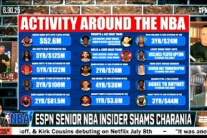 體育資訊07月01日訊 名記Shams在播客節(jié)目《PatMcfeeShow》中連續(xù)說了兩遍:“今晚會有大交易,今晚會有大交易?!?/p>
