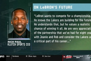 體育資訊7月1日訊 今日,ESPN湖人隨隊(duì)記者Dave McMenamin在電視節(jié)目中進(jìn)一步報(bào)道了在詹姆斯執(zhí)行球員選項(xiàng)后,其經(jīng)紀(jì)人里奇-保羅所發(fā)布的聲明。