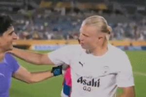 賽后哈蘭德?lián)е寂奶?。本場比賽哈蘭德打進一球,而布努本場神勇發(fā)揮貢獻10次撲救。