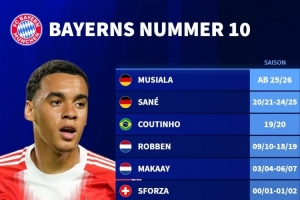 體育資訊7月1日訊 拜仁官方宣布,穆西亞拉將在世俱杯之后改穿10號球衣,德國轉(zhuǎn)會市場列出了拜仁的10號球員。