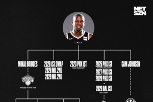 在當(dāng)年的交易中,籃網(wǎng)得到了米卡爾-布里奇斯、卡梅隆-約翰遜、4個(gè)無保護(hù)首輪簽、1個(gè)首輪簽互換權(quán)以及兩個(gè)次輪簽。之后,經(jīng)歷多筆交易,布里奇斯兌換成了5個(gè)首輪、1個(gè)首輪簽互換權(quán)以及一個(gè)次輪簽等資產(chǎn);4個(gè)無保護(hù)首輪中的其中3個(gè),籃網(wǎng)將其和另一個(gè)來自獨(dú)行俠的首輪打包送到火箭,換回了自己的兩個(gè)首輪;約翰遜兌換成了小波特和一個(gè)首輪。