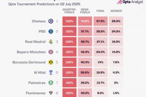 體育資訊07月02日訊 世俱杯8強結(jié)果出爐,opta更新了各家豪門晉級和奪冠概率。身處上半?yún)^(qū)的切爾西奪冠概率登頂,其他4家歐洲球隊分列2-5名。