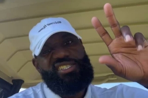 詹姆斯曬出一組他打高爾夫的度假動(dòng)態(tài),并曬出在高爾夫球車?yán)锏母愎肿耘模骸爸胤登驁?chǎng)!??”