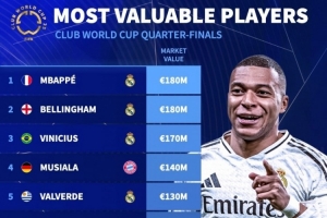 體育資訊7月3日訊 德國轉(zhuǎn)會市場列出了世俱杯8強球員身價排名,姆巴佩、貝林厄姆、維尼修斯前三,前8名皇馬占5席。