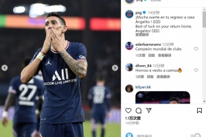 巴黎官方社媒曬出迪馬利亞的照片,并寫道:“祝你回家一切順利,天使!”