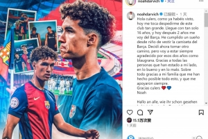 達(dá)維希社媒發(fā)文告別巴薩,他寫道:“大家好,巴薩球迷們!如你們所見,今天是我向這家偉大的俱樂部告別的日子。我16歲時來到這里,如今兩年后我將離開巴薩。