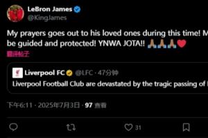 洛杉磯當(dāng)?shù)貢r間凌晨3:11分,湖人球星詹姆斯發(fā)推悼念若塔:“在這艱難時刻,我的心與他的家人們同在!愿你們都能得到指引和庇佑!你永不獨(dú)行,若塔!(YNWA JOTA!)”