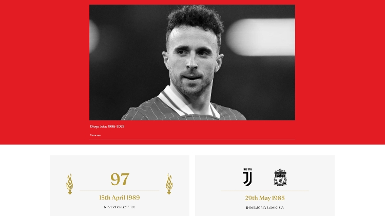 利物浦官網(wǎng)首頁僅保留若塔訃告,以及希爾斯堡、海瑟爾慘案的紀(jì)念欄
