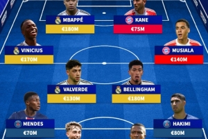 中場:維尼修斯(皇馬,1.7億)、巴爾韋德(皇馬,1.3億)、貝林厄姆(皇馬,1.8億)、穆西亞拉(拜仁,1.4億)