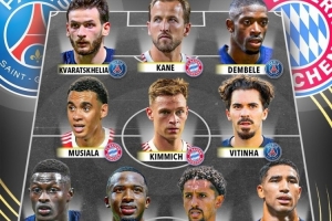Score90列出了巴黎、拜仁合體陣容,登貝萊、凱恩領銜,巴黎8名球員入選。