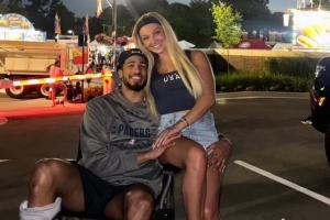 體育資訊7月5日訊 當?shù)貢r間7月4日是美國獨立日,哈利伯頓和女友Jade在室外觀看煙花秀慶祝節(jié)日。