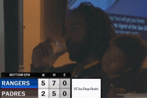 視頻中小卡和孩子在包廂內(nèi)觀看美職棒圣地亞哥教士和得州游騎兵的比賽,他拿著飲料滿臉笑容,看來心情不錯。