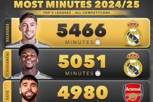 體育資訊07月06日訊 外媒score90統(tǒng)計(jì)了本賽季至今五大聯(lián)賽球員在俱樂部的出場(chǎng)時(shí)間,巴爾韋德以5466分鐘斷層排名第一,第二則是他的隊(duì)友瓊阿梅尼。