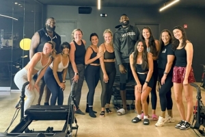 詹姆斯與健身館的教練和學員一同合影。