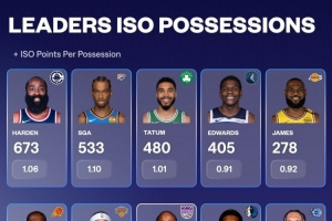 其中哈登單打回合數(shù)673次斷檔領(lǐng)先,亞歷山大533次排在第二,第三的則是塔圖姆480次。單打回合數(shù)4-10名的球員分別是:愛德華茲、詹姆斯、杜蘭特、布倫森、德羅贊、歐文、班凱羅。(注:單打回合數(shù)、單打每回合平均得分如圖)