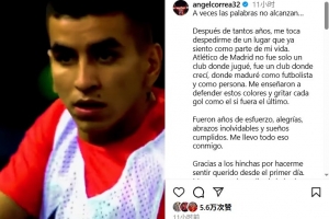 安赫爾-科雷亞寫道:“有些心情難以言表,在歷經(jīng)這么多年后,我不得不向這個(gè)已成為生命一部分的地方道別。馬競不僅是我效力的俱樂部,更是我作為球員和男人成長的搖籃。在這里,我學(xué)會(huì)了為紅白榮耀而戰(zhàn),懂得了每個(gè)進(jìn)球都該像最后一球那樣盡情吶喊。”