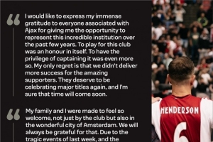 亨德森寫道:“我想向所有阿賈克斯相關(guān)人士表達(dá)我最深的謝意,感謝你們在過去幾年里給我機(jī)會代表這家偉大的俱樂部出戰(zhàn)。為這家俱樂部效力本身就是一種榮譽(yù),能夠有幸擔(dān)任隊(duì)長更是如此。我唯一的遺憾是我們未能為這些了不起的球迷帶來更多成功。他們理應(yīng)再次慶祝重要的冠軍,我相信這一刻很快就會到來。”