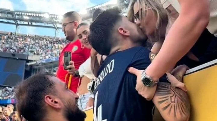 比賽結(jié)束后 ,多納魯馬貼心的把貝拉爾多“舉上看臺(tái)”,讓他可以親吻女友???? ???