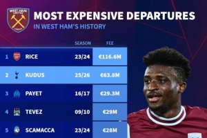 體育資訊7月11日訊 西漢姆邊鋒庫杜斯轉會熱刺,據(jù)德國轉會市場統(tǒng)計,他是西漢姆隊史出售的第二貴球員,最貴球員是1.166億歐轉會費的賴斯。