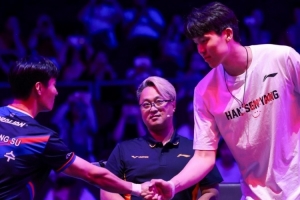 體育資訊7月11日訊 乒乓球WTT美國大滿貫?zāi)袉?/8決賽,中國選手王楚欽對陣韓國選手李尚洙,楊瀚森來到現(xiàn)場為比賽挑邊。