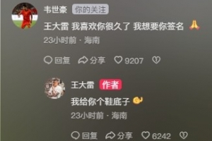 昨天一早,王大雷曾更新社媒,曬出了自己聘請的韓國私人訓(xùn)練師。在這條社媒的評論區(qū),韋世豪留言寫道:“王大雷,我喜歡你很久了,我想要你簽名?!?/p>