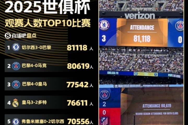切爾西對(duì)陣巴黎的決賽共有81118名觀眾現(xiàn)場(chǎng)觀戰(zhàn),是本屆世俱杯觀賽人數(shù)最多的一場(chǎng)。