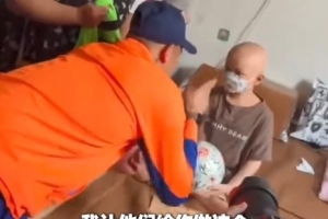韓鵬代表球隊(duì)送給了這名小球迷全隊(duì)的簽名足球,并祝福這名小球迷早日康復(fù)。