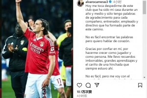 A費在社交媒體上發(fā)文,與本菲卡告別:“今天,我不得不告別這個在過去一年半的時間里如同家一般的俱樂部。我只想對每一位隊友、教練、員工和管理層成員表達最深切的感謝,感謝你們陪伴我走過這段旅程。