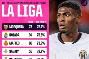 Opta指出,莫斯克拉是西甲阻止對(duì)手過人成功率最高的球員,對(duì)手73次嘗試過掉他,其中76.7%的過人被他阻止,在嘗試阻止對(duì)手過人次數(shù)50+的西甲球員中,他的成功率最高。