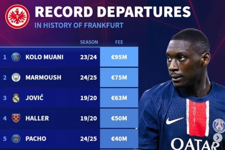 如果這筆轉(zhuǎn)會按照目前的進(jìn)展順利完成,?;倏擞型蔀榉ㄌm克福隊史轉(zhuǎn)出標(biāo)王,超越9500萬歐的穆阿尼。