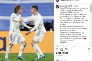 莫德里奇社媒曬出與巴斯克斯的合照,并寫道:“盧基!你知道的,你是我在皇馬遇到的最好的人之一。”