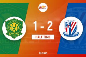 上半場傷停補時6分鐘,半場結束,北京國安暫1-2上海申花。