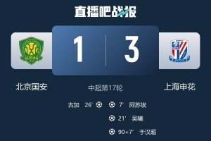 體育資訊7月19日訊 中超第17輪,北京國(guó)安1-3不敵上海申花。
