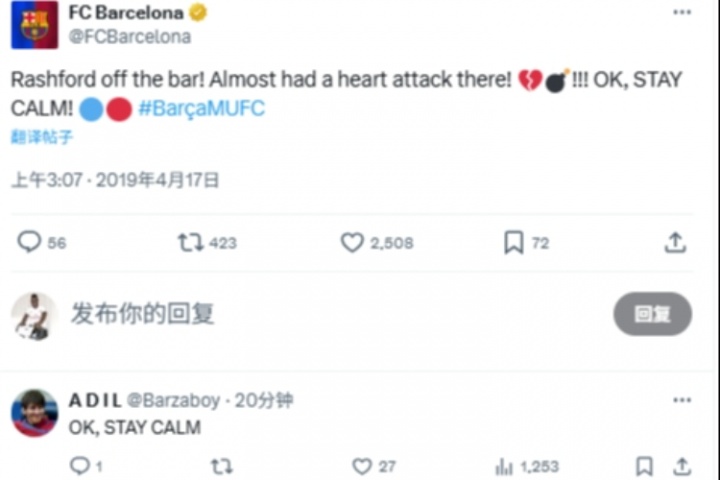 有球迷翻到19年4月17日歐冠巴薩vs曼聯(lián)時,巴薩官方推特的一條推文:“拉什福德?lián)糁袡M梁!差點心臟病發(fā)作!好吧,冷靜!”球迷今日跟上評論:“好吧,冷靜!”
