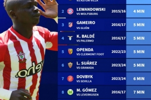體育資訊1月18日訊 德轉(zhuǎn)盤點了五大聯(lián)賽近十年最快上演帽子戲法紀錄榜,其中馬內(nèi)3分鐘3球最快,萊萬對陣沃爾夫斯堡4分鐘次席(9分鐘5球),以下為具體榜單: