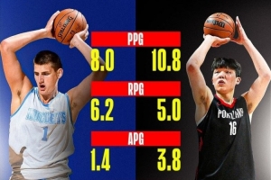 (約基奇夏聯(lián)場均8.0分6.2籃板1.4助攻1.4蓋帽;楊瀚森場均10.8分5.0籃板3.8助攻1.6蓋帽)