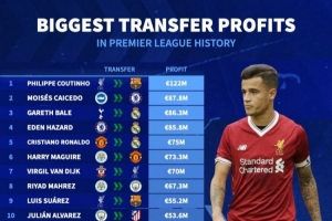 體育資訊7月21日訊 《轉(zhuǎn)會(huì)市場(chǎng)》列出了英超歷史賣人盈利情況,利物浦出售庫(kù)蒂尼奧給巴薩凈賺1.22億歐元居首。