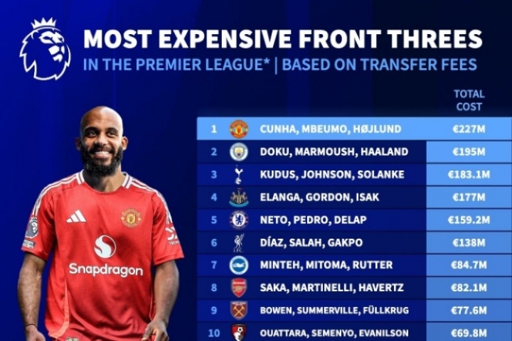 體育資訊07月22日訊 德轉(zhuǎn)今日盤點(diǎn)了英超各隊(duì)鋒線三叉戟的轉(zhuǎn)會(huì)費(fèi)排名,其中曼聯(lián)以2.27億歐居首,曼城1.95億歐第2。