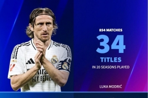 莫德里奇:39歲,身價(jià)400萬(wàn)。20個(gè)賽季,854場(chǎng),34冠